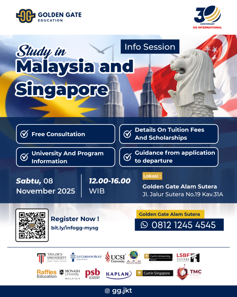 DON’T DELAY! Secure your spot now and let Golden Gate Education be your bridge to academic success in Malaysia or Singapore. We look forward to seeing you on Saturday, 8 November 2025 at Golden Gate Alam Sutera!